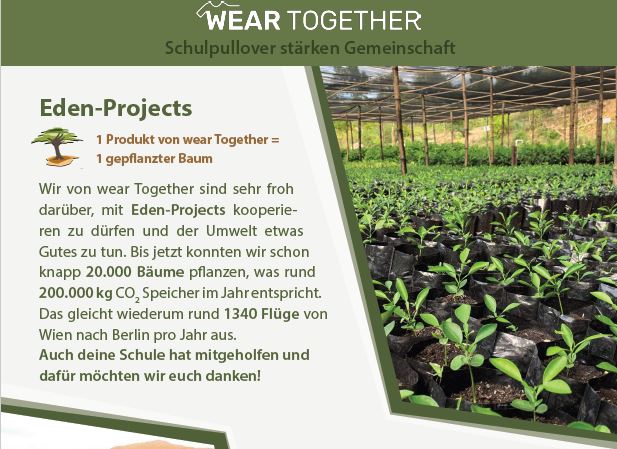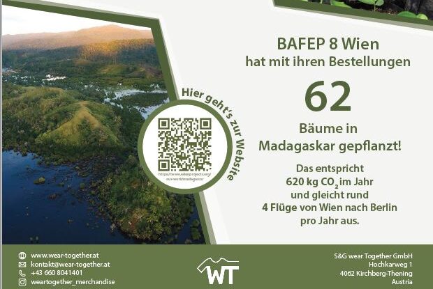 Da wir neben zertifizierten Produkten und sicheren Arbeitsbedingungen in der Produktion und bei unserem Druckpartner in Deutschland auch etwas für die Umwelt beitragen wollen, haben wir pro verkauftem Produkt einen Baum gepflanzt – somit hat auch Ihre Schule einen Beitrag zu den knapp 20.000 Bäumen geleistet, die wir bisher pflanzen konnten und dafür möchten wir Ihrer ganzen Schulgemeinschaft danken.