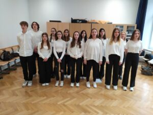Ende Jänner dieses Jahres beschlossen eine Großgruppe der 2B, bestehend aus 12 jungen Damen und zwei jungen Herren, und Herr Prof. Nening sich auf die Teilnahme am diesjährigen Wiener Landesjugendsingen vorzubereiten. In 8 zusätzlichen Stunden (jeweils am Freitag nachmittags!) sowie etlichen Proben in der Winterprojektwoche und kurz vor unserem Auftritt wurden 3 Stücke für den Auftritt einstudiert: ein Tiroler Volkslied und ein 4-stimmiger Kanon wurden a cappella intoniert, das Lieblingsstück „Skyfall“ (aus dem gleichnamigen James Bond-Film) mit Klavierbegleitung.