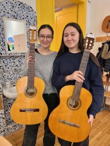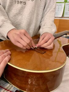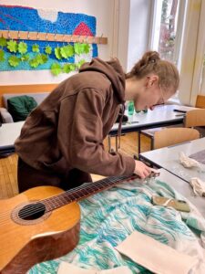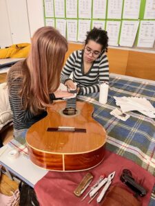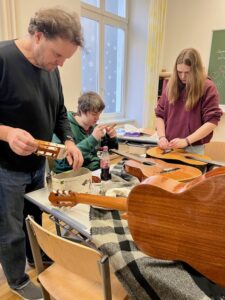 Nach dem Entfernen der alten Saiten wurden die Schulgitarren von unseren Schüler:innen gereinigt und mit Zitronenöl gepflegt. Danach wurden alle Gitarren mit neuen Saiten bespannt, was anfangs gar nicht so leicht war. Die Schüler:innen haben das mit Bravour gemeistert! Sie lernten im Rahmen der Gitarrenwerkstatt, wie sie daheim ihre Gitarren pflegen können und haben mit voller Begeisterung die Schulgitarren auf Hochglanz gebracht.