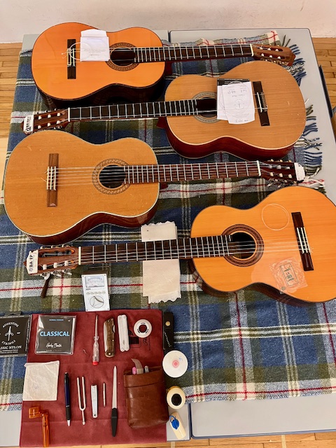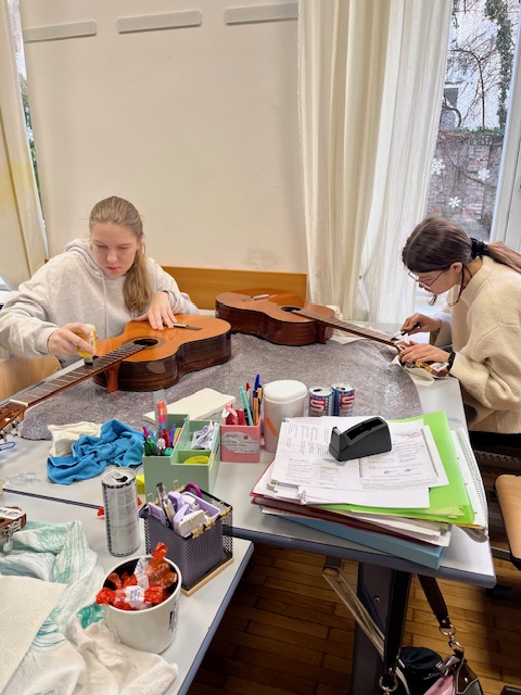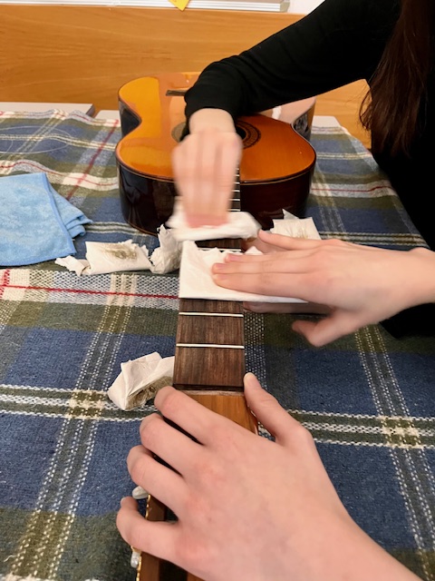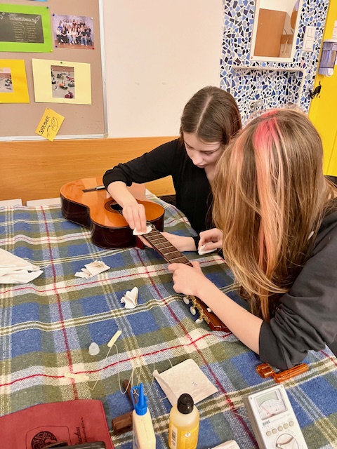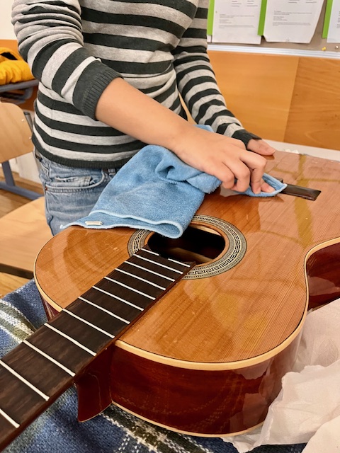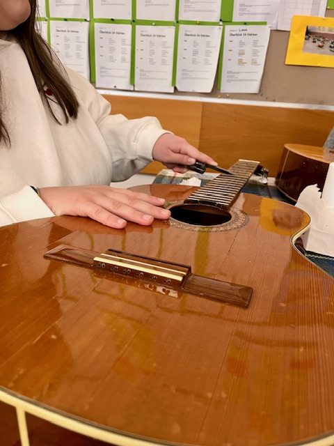 Nach dem Entfernen der alten Saiten wurden die Schulgitarren von unseren Schüler:innen gereinigt und mit Zitronenöl gepflegt. Danach wurden alle Gitarren mit neuen Saiten bespannt, was anfangs gar nicht so leicht war. Die Schüler:innen haben das mit Bravour gemeistert! Sie lernten im Rahmen der Gitarrenwerkstatt, wie sie daheim ihre Gitarren pflegen können und haben mit voller Begeisterung die Schulgitarren auf Hochglanz gebracht.