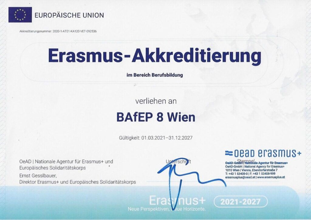 im Bereich Erasmus+ Berufsbildung akkreditiert und wird somit bei berufsbezogenen Projekten wie z.B. Auslandspraktika, internationale Fortbildungen durch Fördergelder der Europäischen Kommission großzügig unterstützt. Erasmus+ bietet unseren Schüler*innen die Möglichkeit einen Teil ihrer verpflichtenden Praktika im Ausland zu absolvieren. Neben den wertvollen Praxiserfahrungen werden die sprachlichen Kenntnisse verbessert und die persönliche Weiterbildung und Toleranz gegenüber anderen Kulturen gestärkt.