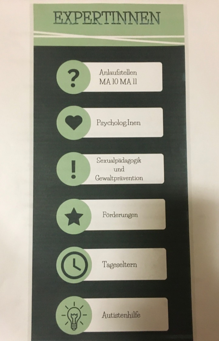 Ziel dieser Gruppe war es ein Dokument für den Kindergarten zu erstellen, welches in spezifischen Situationen wie Todesfall, sexueller bzw. körperlicher Übergriff und Auffälligkeiten des Kindes, als Praxisleitfaden verwendet werden kann. Dieses Dokument soll als Vernetzung zwischen Kindergarten, Eltern und Beratungsstellen wie dem roten Anker, Verein Möwe, MA11, MA10, sowie zur Recherche von Fortbildungen und Workshops dienen. Ein solches Netzwerk wäre laut der Gruppe wünschenswert, da es Informationen in bestimmten Fällen für Betroffene leichter zugänglich macht.