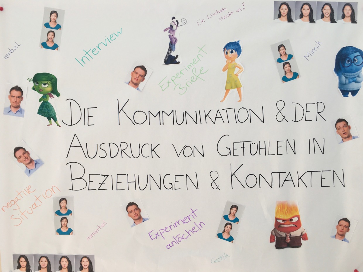 Dafür wurden in Einzelarbeit Interviews mit Bezugspersonen geführt und die Antworten dann im Austausch mit der Gruppe besprochen. Außerdem führte diese Gruppe einige Experimente mit fremden Personen durch, um die Reaktionen der Menschen zu beobachten (Anlächeln, Briefe mit positiven Sätzen verteilen, ...). Des Weiteren wurde der Film „Alles steht Kopf“ angeschaut, der laut der Gruppe bereits für den Kindergarten geeignet ist.