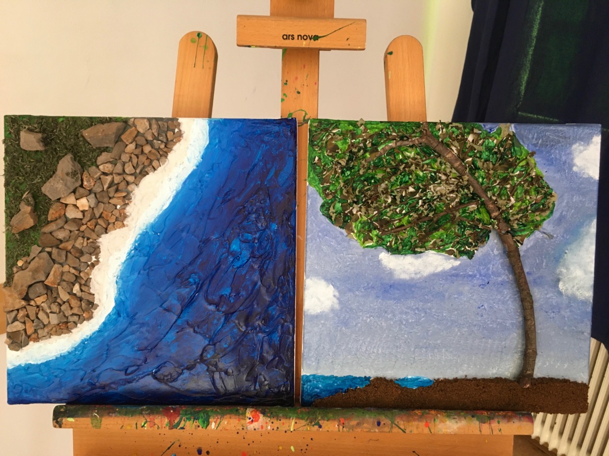 Diese beiden Gruppen wählten das Thema „Kreativität“, jedoch mit anfänglich unterschiedlichen Fragestellungen. Zum einen wollten sie herausfinden, was Kreativität fördert und zum anderen, was Kreativität mit einer Gemeinschaft macht. Die Gruppen haben sich auf ein gemeinschaftliches Arbeiten verständigt und haben sich dafür regelmäßig an unterschiedlichen Orten getroffen. Im entspannten freien Arbeiten kamen sie in einen kreativen Prozess hinein. Mit unterschiedlichen mitgebrachten Materialien entstanden verschiedenste Handarbeiten und Kunstwerke. (z.B. Bilder, Sitzmatte, Pullover, Körbchen,...)