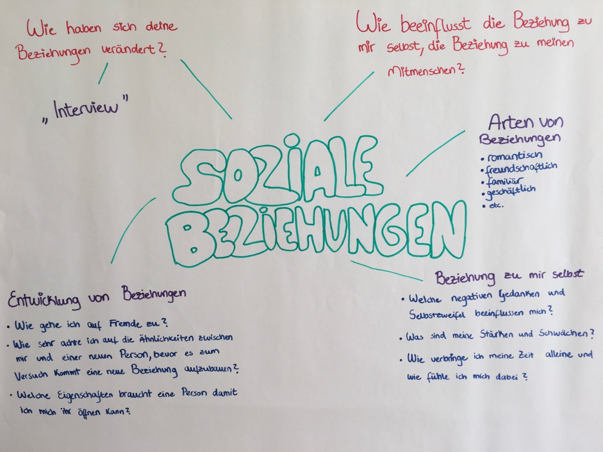 Ziel dieser Gruppe war die Auseinandersetzung mit sich selbst, aber auch mit dem eigenen Umfeld. Dafür wurden zusammen Leitfragen ausgearbeitet, die es dann als Einzelperson zu beantworten galt und über die jeweiligen Antworten anschließend im Austausch mit der Gruppe gesprochen wurde. Die Fragestellungen umfassten Themenbereiche wie die Entwicklung von Beziehungen, Veränderungen in Beziehungen, Definition von Beziehung, Arten von Beziehungen und die Beziehung zu sich selbst. Des Weiteren wurden eigene Fragen erstellt, um Bezugspersonen zu interviewen und die derzeitige und zukünftige gemeinsame Beziehung näher zu beleuchten.